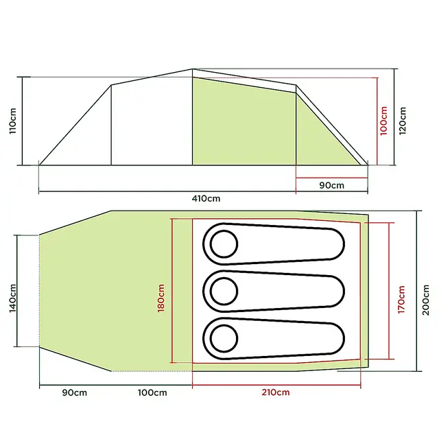 Tasman 3 har en aerodynamisk topptunnelstruktur med et romslig soverom og optimalisert hodehøyde for ekstra komfort. Med større sove- og oppholdsrom for økt komfort, er Tasman 3 rask å sette opp og gir overlegen værbeskyttelse.