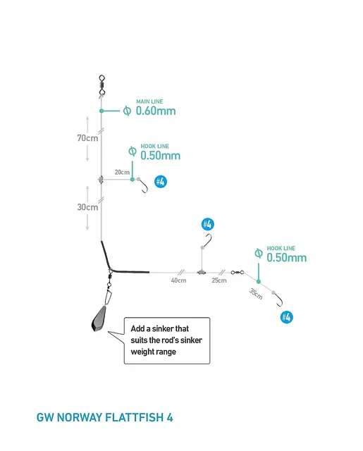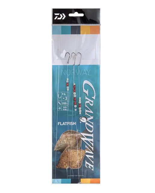 Daiwa Grand Wave Norway Rig Denne riggen er laget for flatfisk og andre arter som lever hardt på bunnen. Designet for båtfiske, arbeid med riggen når du driver ved å dra ellersmå løft og stopp. Agn den kroker med ragworms, reker eller fiskestrimler. Når flater biter gi dem noen sekunder før løfter sakte. Hvis fisk er på; sett kroken og rulle opp. Hvis ingen fisk på; senk rigge ned igjen.