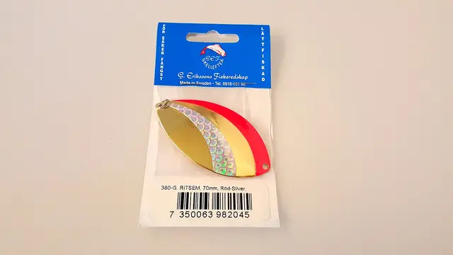 Klassisk blink som fiskes med rolige bevegelser. Ritsem er kjent for å levere stor fisk. Leveres ferdig montert med Sufix fortom og VMC krok. Lengde 70mm. Vekt 14g.