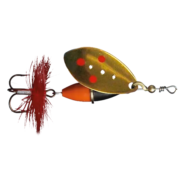 Denne spinneren har tofarget kropp, lydhull i skjea og en flue på treblekroken. Velegnet i grumsete vann eller
